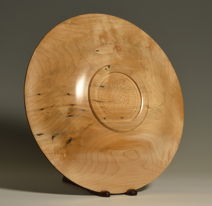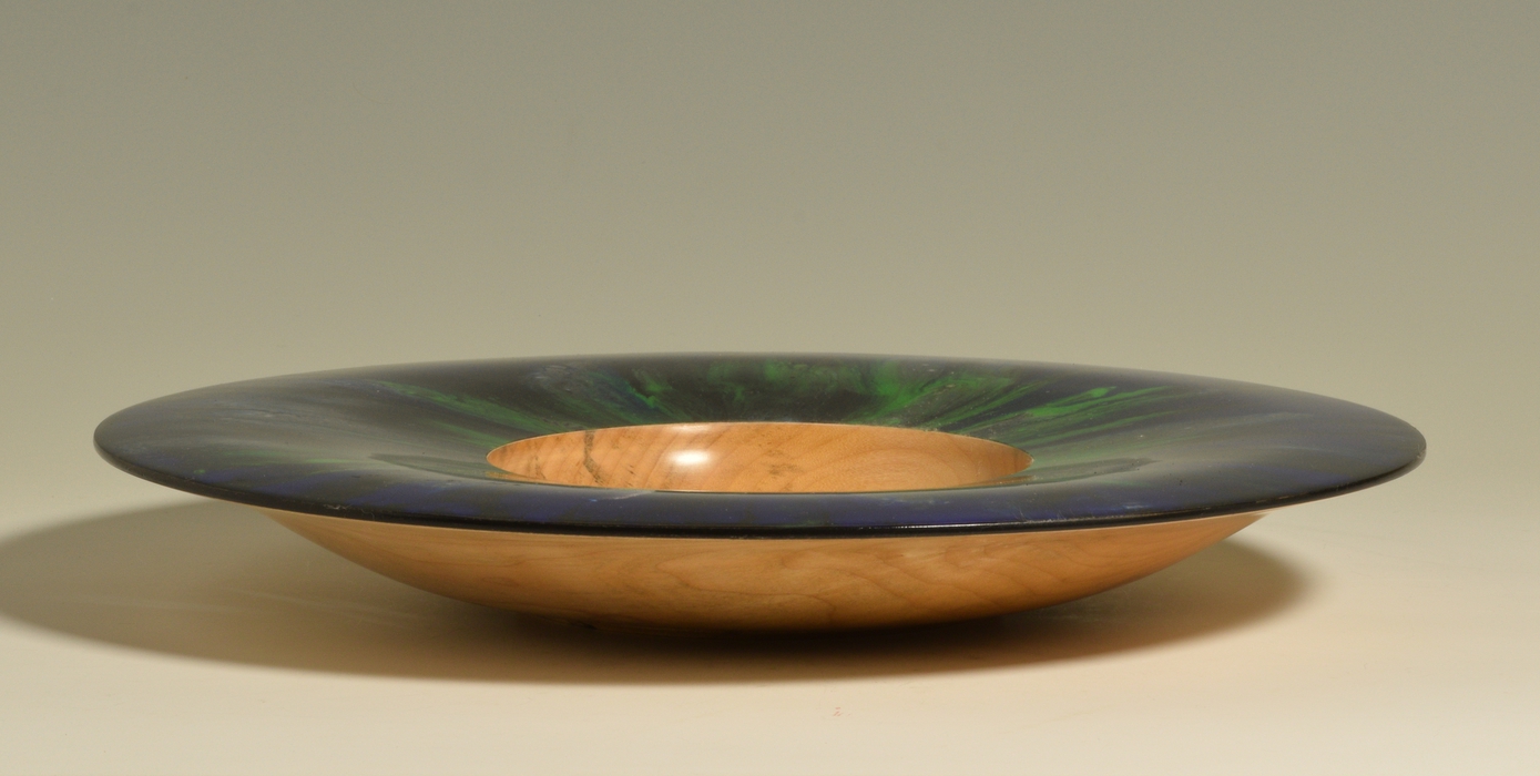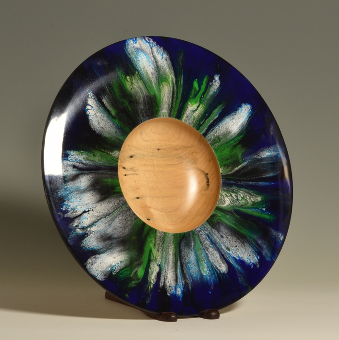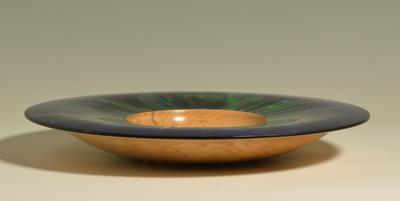 This decorative platter was turned from hard maple and has a wide rim that has been decorated with blue, green and silver acrylic paints. The paints were applied in a wet layer, pulled through one another and allowed to interact, creating all kinds of intricate cells and patterns. The paint was then top-coated with several layers of high gloss polyurethane to provide protection and depth to the final finish. The back of the platter features a ogee curve and a small ring foot that raises the form off of the surface that it sits on. The bottom of the foot has been decorated with a textured medallion which serve to demonstrate that the bottom of the platter was turned with as much care and attention to detail as the rest of the piece.