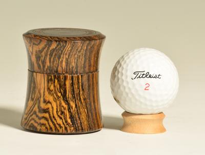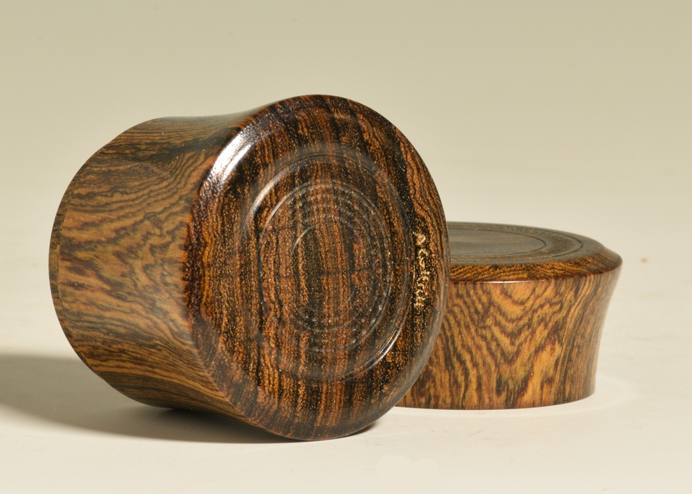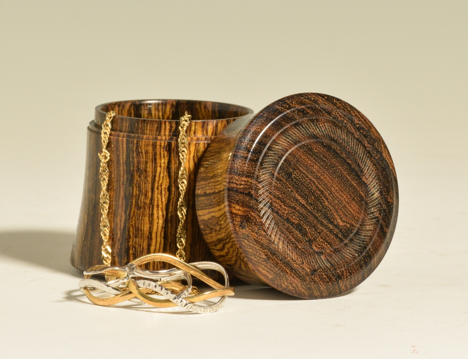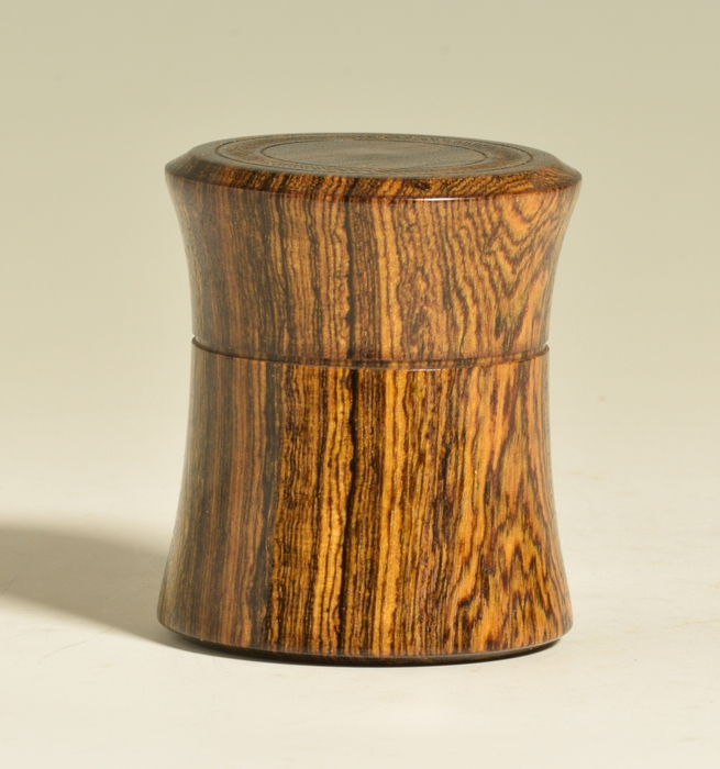 This hour glass shaped box is turned from Bocote (Cordia spp.), a hardwood that is native to Mexico and Central and South America. The lid of this box features a ring of texturing on, while additional texturing on both the bottom and inside of the lid provide a little surprise when the box is opened or handled. A simple kerf decorates the seam between the lid and the base without disrupting the lines of the form. Finished with an oil and shellac polish and then buffed to a nice semi-gloss sheen, this box feels as good as it looks. The perfect place to store your most precious jewellery or keepsakes