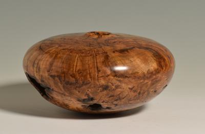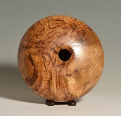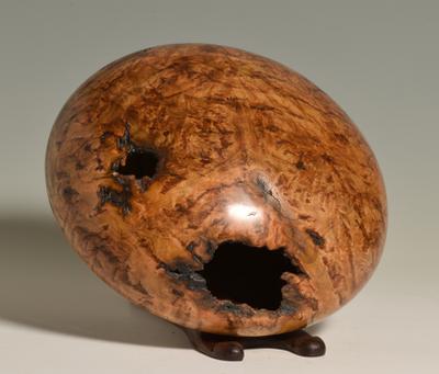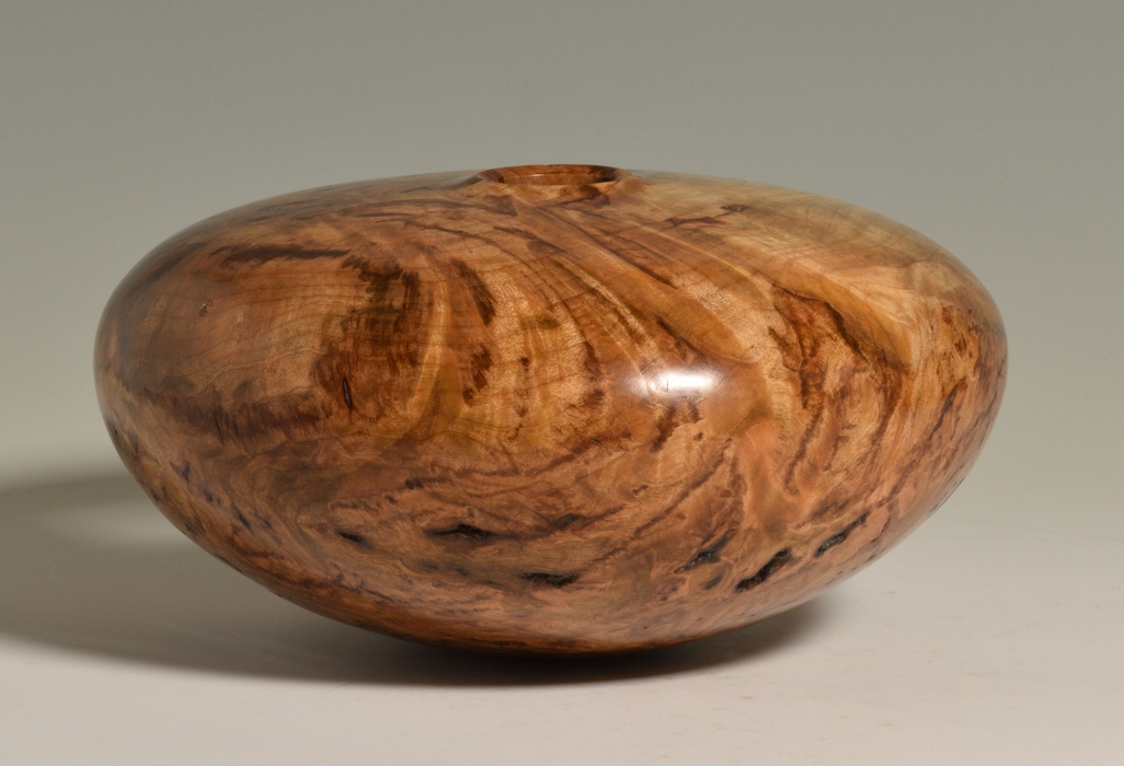 This elegant hollow form was turned from a beautiful piece of hard maple burl and features several bark inclusion and voids. The walls of this form are relatively thin giving it a light, delicate feel, but not so thin as to be fragile. The interior of the form is unfinished, and only lightly sanded, leaving an undulating surface from the hollowing tools. The bottom of the hollow form has been slightly dished to ensure that it will sit on a flat surface without rocking. Finished with a Danish oil and buffed to a pleasant gloss, the finish enhances the wood and the subtle details while still providing that unmistakable feel of wood. The perfect form to decorate your shelf or hold dry flowers on your dining room table.