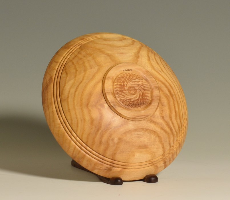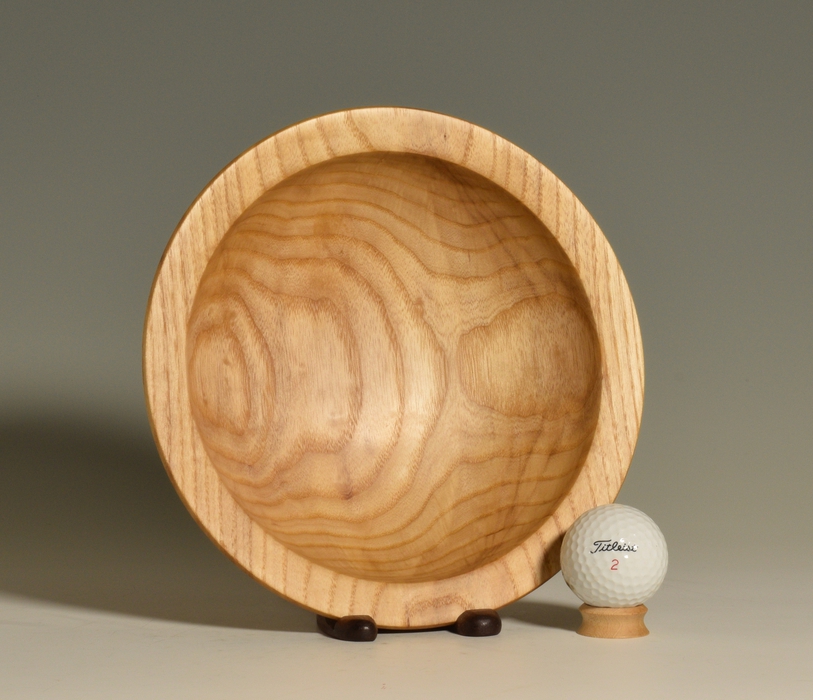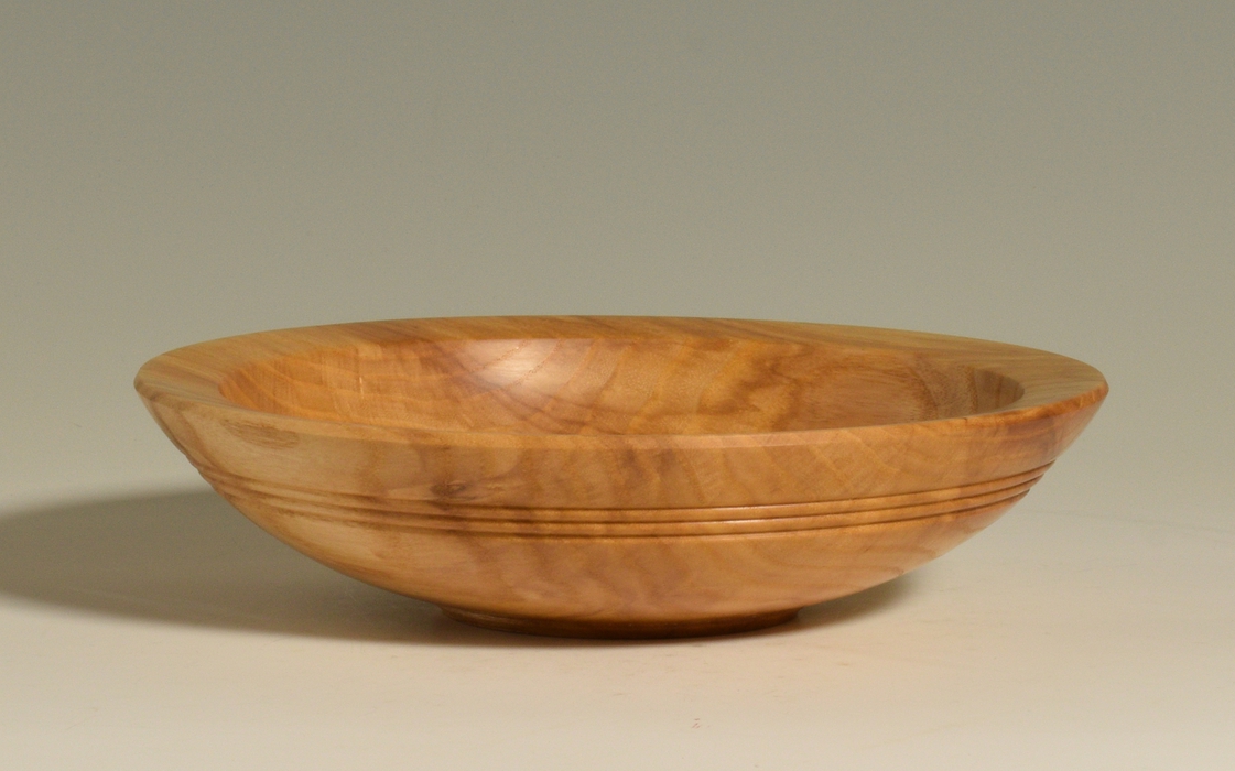 This 8" bowl is the inner bowl from a three bowl set cored from a single large block of white ash (Fraxinus americana). This bowl features clean lines and a simple, yet pleasing shape. The outer surface is decorated with a pair of delicate beads and the cleanly cut rim slopes gently inwards. A small ring foot raises the bowl off of the surface that it is sitting on, and texturing inside of the ring foot demonstrates that the bottom of the bowl was turned with as much attention to detail as the rest of the piece. Finished with linseed oil and beeswax, this piece feels as good as it looks and will only get better through time.