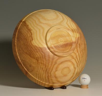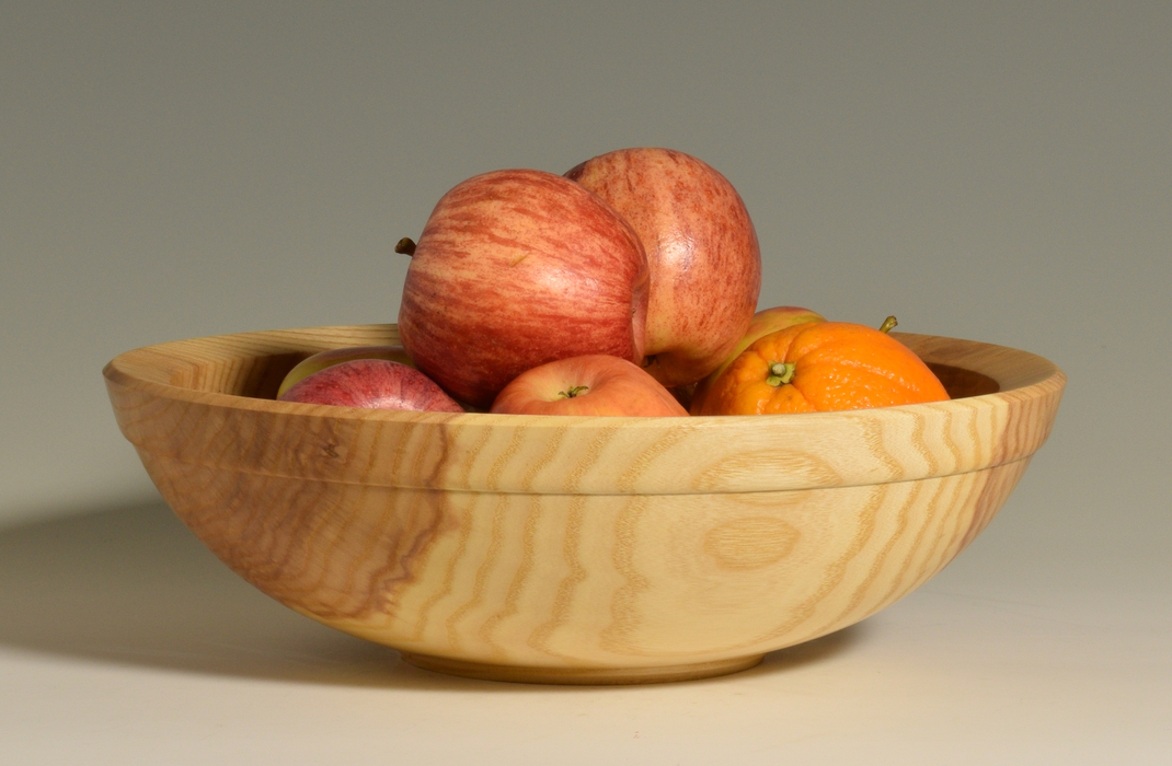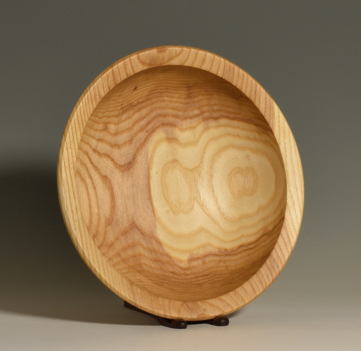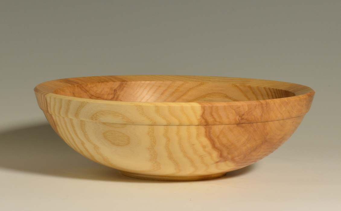 This 12" bowl is the middle bowl from a three bowl set cored from a single large block of white ash (Fraxinus americana). This bowl features clean lines and a simple, yet pleasing shape. The outer surface is decorated with sublte raised boss around the outside of the rim. The top surface of the rim is cleanly cut and slopes gently inwards. The distinct contrast between the heart wood and sapwood provide some additional visual interest. A small ring foot raises the bowl off of the surface that it is sitting on, and texturing inside of the ring foot demonstrates that the bottom of the bowl was turned with as much attention to detail as the rest of the piece. Finished with linseed oil and beeswax, this piece feels as good as it looks and will only get better through time.