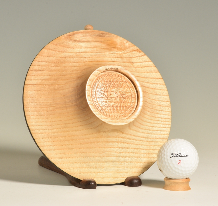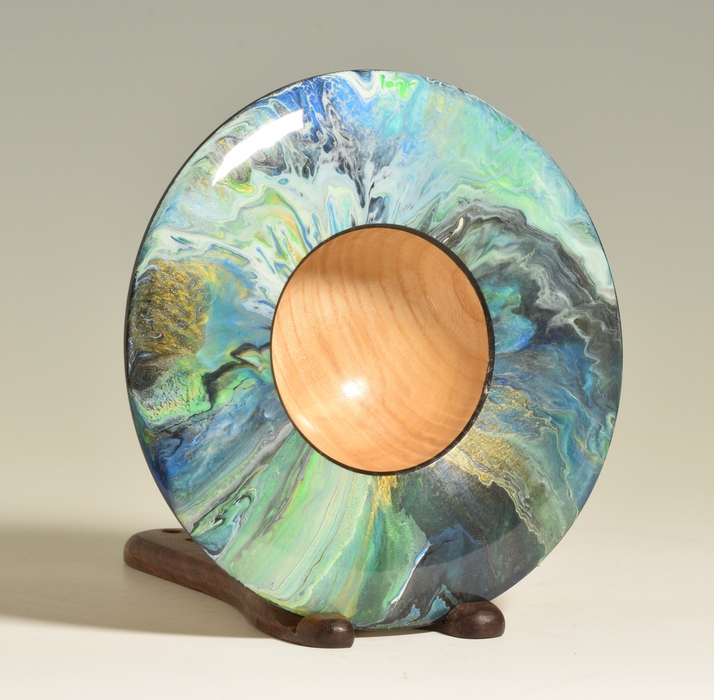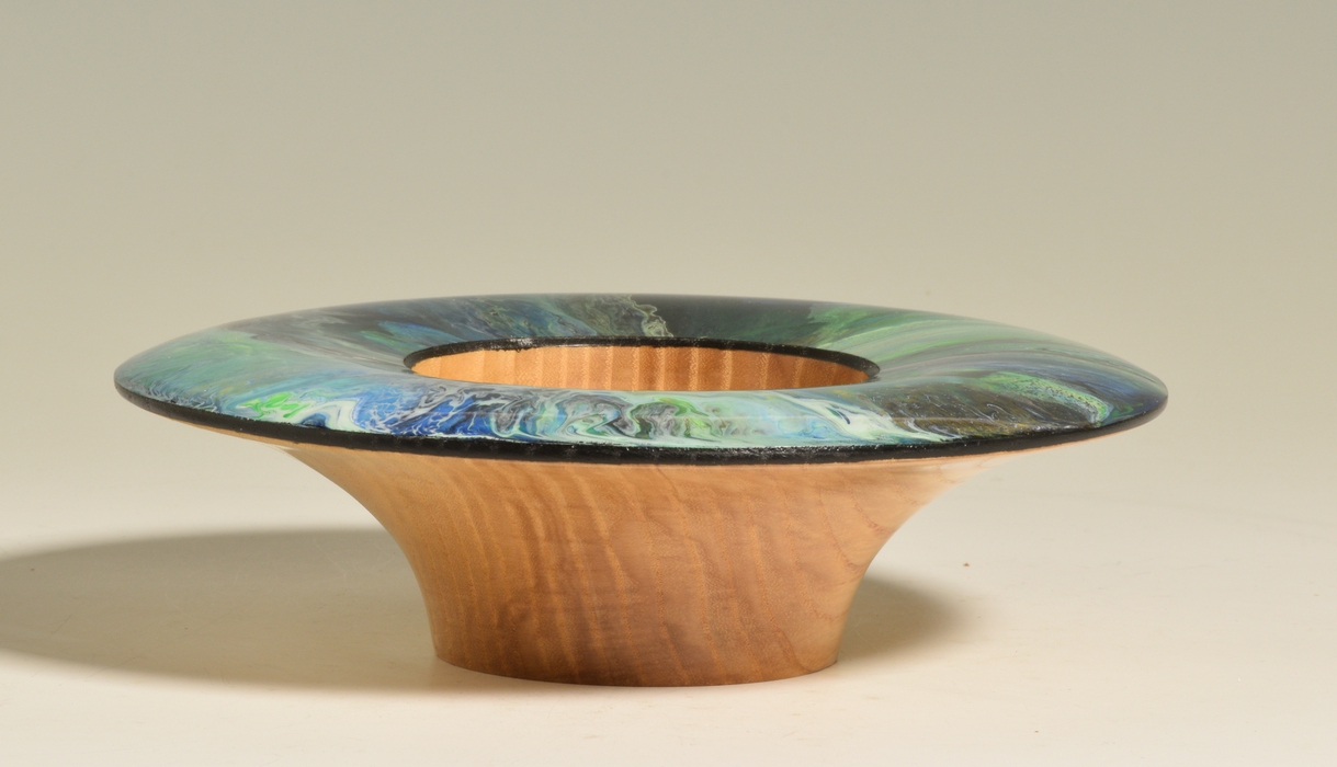 This decorative bowl was turned from white ash and has a wide rim that has been decorated with various shades of blue, green and gold and white acrylic paints. The paints were poured in a wet layer near the center of the bowl and tilted to cover the entire surface and allowed to interact, creating all kinds of intricate cells and patterns. The paint was then top-coated with several layers of high gloss polyurethane to provide protection and depth to the final finish. The back of the platter features simple curve from the base to the rim. The bottom of the foot has been decorated with a textured medallion which serve to demonstrate that the bottom of the platter was turned with as much care and attention to detail as the rest of the piece.