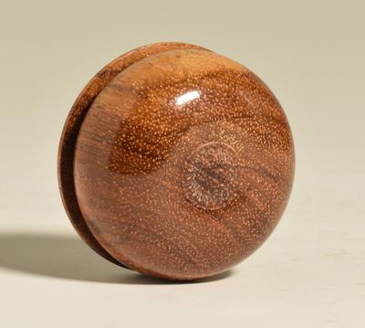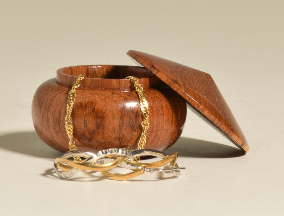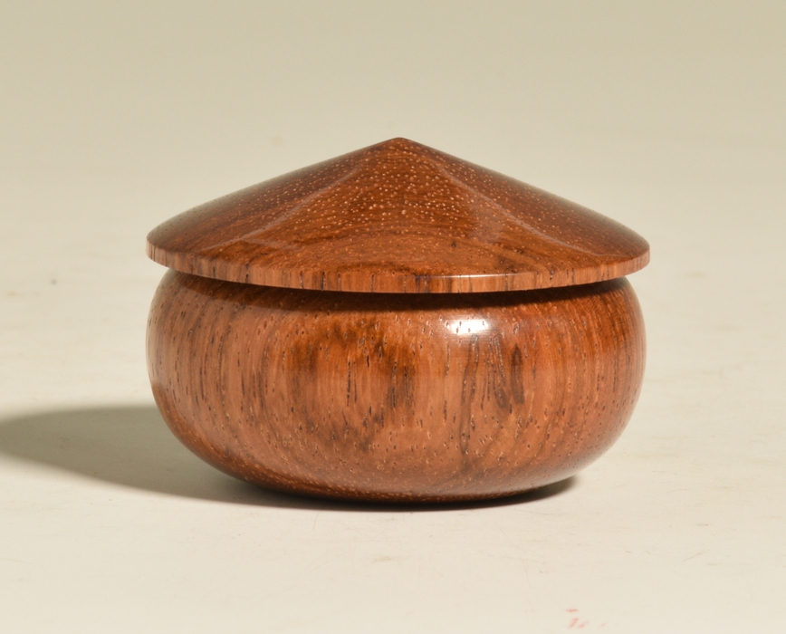 This little box is turned from a nicely figured piece of Yucatan Rosewood (Dalbergia tucurensis) and features a conspicuous patch of lighter sapwood that adds considerable visual interest and makes this box truly one of a kind. The box was turned in a way that ensures continuous grain from the body through the lid. Textured rings on both the underside of the lid and the underside of the base provide a little surprise when the box is opened or handled. Finished with an oil and shellac finish and then polished to a pleasant shine, this box is as nice to hold as it is to look at. The perfect place for your most precious keepsakes or jewelry. An heirloom quality box that will be in your family for generations.