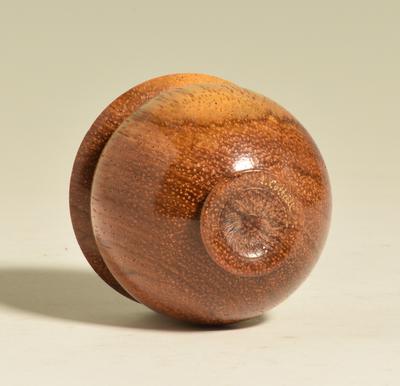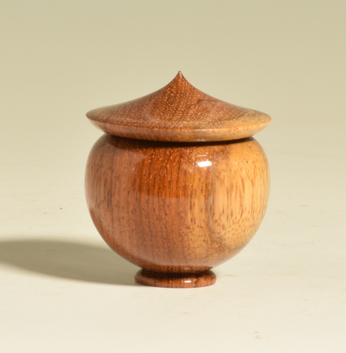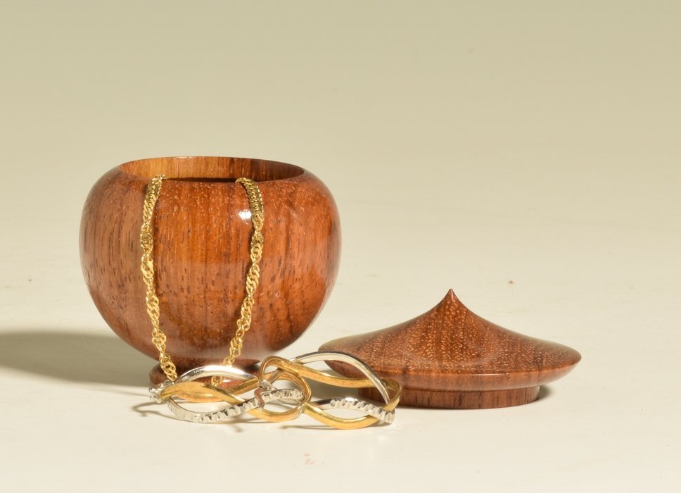 This little box is turned from a nicely figured piece of Yucatan Rosewood (Dalbergia tucurensis) and features a conspicuous patch of lighter sapwood that adds considerable visual interest and makes this box truly one of a kind. The box was turned in a way that ensures continuous grain from the body through the lid. Textured rings on both the underside of the lid and the underside of the base provide a little surprise when the box is opened or handled. Finished with an oil and shellac finish and then polished to a pleasant shine, this box is as nice to hold as it is to look at. The perfect place for your most precious keepsakes or jewelry. An heirloom quality box that will be in your family for generations.