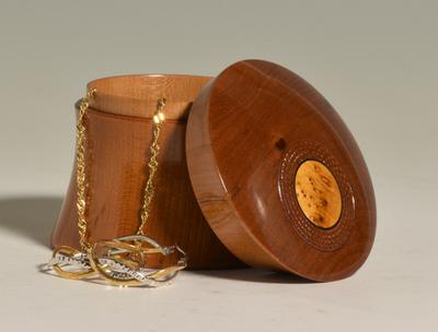 This hour glass shaped box is turned from Bocote (Cordia spp.), a hardwood that is ...
